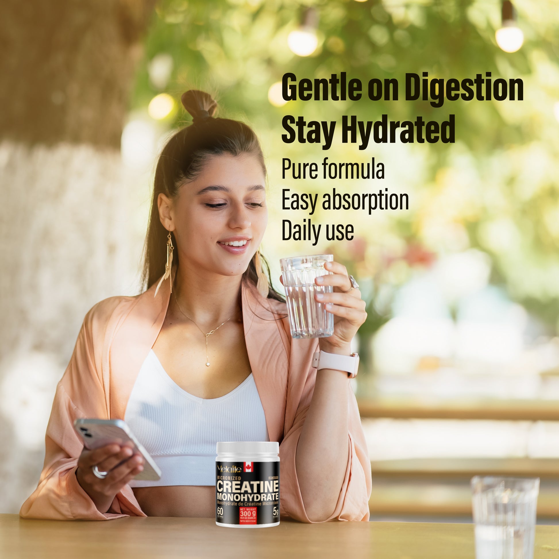 Creatine supports muscle hydration. For best results, stay well-hydrated throughout the day by drinking adequate fluids.